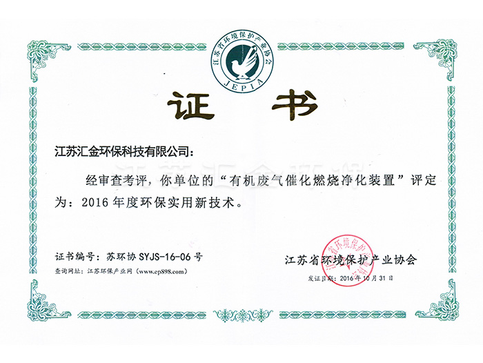 有機(jī)廢氣環(huán)保實用技術(shù)證書
