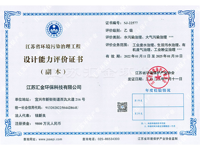 江蘇省環(huán)境污染治理工程設(shè)計(jì)能力評(píng)價(jià)證書(shū)